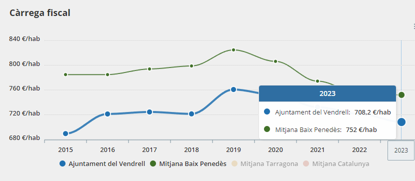La càrrega fiscal de l’Ajuntament del Vendrell ha estat històricament per sota de la mitjana del Baix Penedès, però per sobre de la mitjana de la província de Tarragona. En 2023, aquesta xifra es va situar en 708,2€ per habitant. Al 2019 la càrrega fiscal era de 760,8; és a dir, en quatre anys la càrrega fiscal ha baixat en 52€ per habitant.