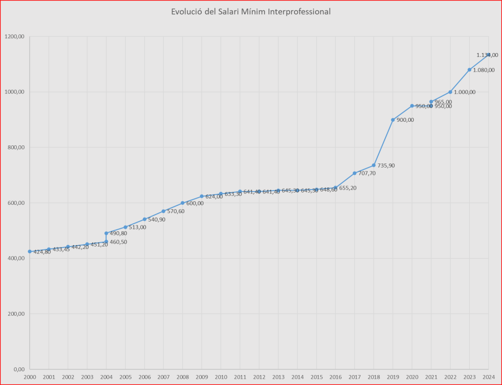 Aquesta baixada de càrrega fiscal dels darrers anys no es pot mantenir sempre, bàsicament, per què el cost dels serveis s’ha incrementat, l’electricitat s’ha incrementat, i els salaris s’incrementen cada any, De fet, el Salari Mínim Interprofessional s’ha vist incrementat un 73,08% entre els anys 2016 i 2024. Molts contractes de serveis estan vinculats a sectors a on el salari mínim interprofessional és una referència important en el càlcul de les despeses de personal de les empreses que ens presten serveis a tots, a l’ajuntament i al conjunt de la ciutadania.
