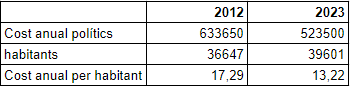El quadre de retribucions de 2024 s’haurà de modificar donat que Christian Soriano deixarà de percebre la retribució de 46000 € anuals a partir de la constitució del Parlament de Catalunya i passarà a cobrar assistències amb un import màxim anual d’11.500€, rebaixant encara més l’import de les retribucions. En termes de cost per habitant, si cada ciutadà al 2012 aportava 17,29 € a l’any per pagar els polítics, al 2023 la quantitat era de 13,22€.